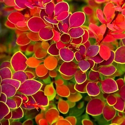 Листва барбариса Тунберга густая, а листья имеют округлую форму и мелкий размер (от 1 до 3 см). Они окрашены в бордовый цвет с белыми, розовыми и серыми пятнышками. Летом, листва приобретает красные и оранжевые оттенки, а осенью она окрашивается в ярко-красный цвет. Цветы расположены по всему побегу и имеют желтую окраску внутри, а снаружи они красные. Они обладают приятным душистым ароматом и могут быть одиночными или собраны в соцветия.