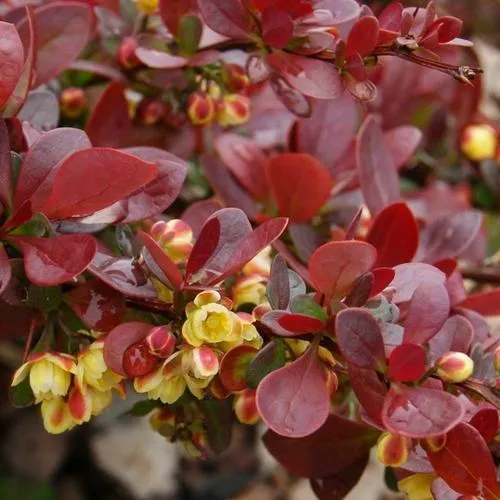 Этот вид барбариса отличается великолепной декоративностью на протяжении всего вегетационного периода. Листья маленькие, до 3-4 см в длину, обладают насыщенной окраской, меняющейся в зависимости от сезона: весной на них загорается лимонно-желтая нота, летом они остаются лимонного оттенка, а осенью вновь радуют успокаивающим ярко-красным цветом. Благодаря этому, барбарис 'Кармен' с легкостью впишется в любой сад, добавляя красок и создавая атмосферу уюта.