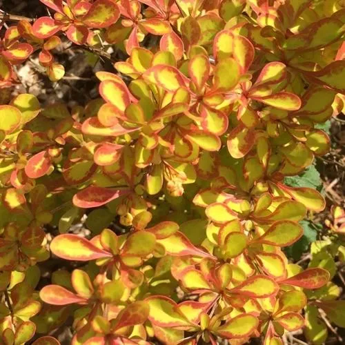 Ухоженный декоративный барбарис отличается густой облиственностью. Листовые пластины растения имеют округлое строение, являются маленькими, имеющими плотные поверхности. Цвет листвы представляется желтовато-зеленым. Подобный окрас листья имеют в весенний период, а в летний сезон прибавляются оранжево-красные оттенки на краевых участках. Осенний цвет листвы является красным и оранжевым. Пластинки остаются на кустарнике в период с апреля по октябрь.