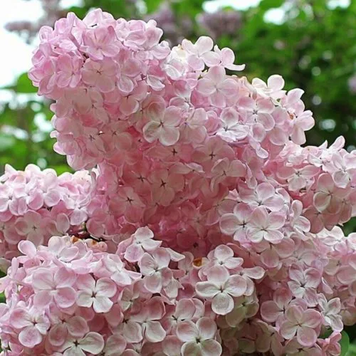 Цветение наступает позднее большинства сортов, что особенно ценно для любителей длительного сезона сирени. Бутоны окрашены в тёмно-розовый тон с шоколадным и слегка зелёным отливом. Когда они раскрываются, формируются крупные простые цветки до 3 см диаметром с уникальной гаммой: нежно-розовый с жемчужным блеском снизу и тонкими кофейными оттенками в глубине венчика. Соцветия широкопирамидальные, плотные, достигают 22–25 см в длину и 20–23 см в ширину, каждая метёлка может содержать более тысячи цветков. Цветение продолжается с середины мая до начала июня и сопровождается ярко выраженным, но мягким ароматом. Окраска устойчива к солнцу, что позволяет кусту сохранять декоративность на протяжении всего периода.