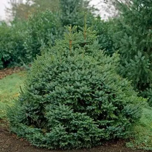 Годовой прирост в высоту – 35 см, в ширину - 15 см. Взрослое растение высотой 3 м, шириной 1,5 м. Крона стройная, плотная, правильной конической формы. Ветви густые, тонкие, плотные, короткие. Хвоя толстая, густая, блестящая, двухцветная. Сверху –зеленая, снизу – бело-голубая. Шишки коричневого цвета, длиной до 6 см.