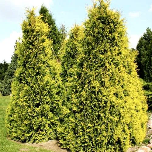 Туя западная Салланд – сорт с конической кроной и золотисто-желтыми побегами.
