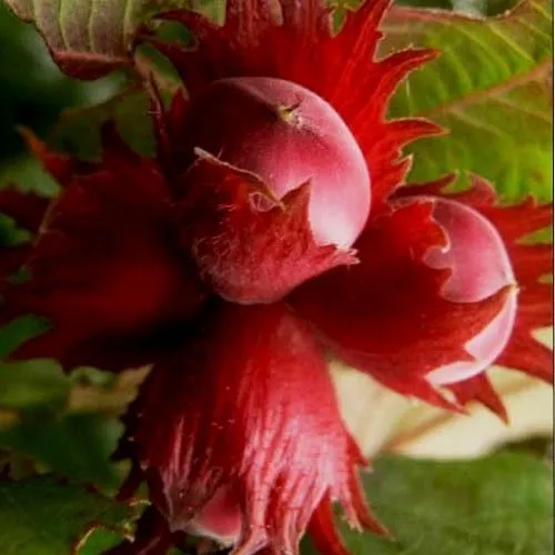 Плоды фундука Багрянец – это средние или крупные орехи (1,5–2 см в длину), собранные в гроздья по 5–8 штук. Пурпурные обертки (плюски) усиливают декоративный эффект. Скорлупа тонкая, легко раскалывается, а ядро составляет до 50% массы ореха. Вкус насыщенный, сладковатый, с богатым ореховым послевкусием (оценка дегустаторов – 4–4,6 балла). Орехи созревают в конце августа – начале сентября, что относит сорт к среднепоздним. Урожайность впечатляет: с 7–8-летнего куста собирают 3–5 кг, а взрослые растения дают до 12 кг. Орехи хранятся до 2 лет без потери вкуса, если высушить их в течение 1–2 недель после сбора.