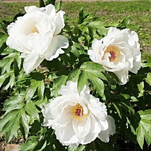 Листья растения имеют ярко-зеленую окраску и ажурную форму, которая добавляет кусту легкости и элегантности. На каждом растении распускается от 30 до 70 крупных цветков, которые дарят незабываемое зрелище. Полумахровые цветы диаметром до 25 см поражают своей нежностью и бархатистыми лепестками светлого оттенка. Желтые тычинки на фоне утонченных лепестков создают эффектный контраст. Цветение происходит в мае-июне и продолжается 12-14 дней, при этом вы можете наслаждаться обилием цветков и их волшебным ароматом.