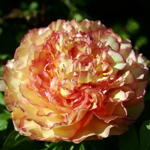 На одном растении пиона древовидного Золотая россыпь может появиться от 30 до 70 цветов. Цветки махровые и корончатые, имеют крупный размер - до 17 см в диаметре. Окраска цветков золотисто-желтая с розовой каймой создает неповторимую комбинацию. Интересным фактом является то, что у этого пиона цветки двухцветные, с розовой каймой. Лепестки имеют тонкую волнообразную форму, а тычинки пиона Золотая россыпь окрашены в желтый цвет. Кроме того, этот пион обладает средним ароматом.