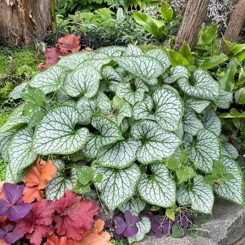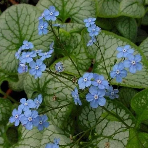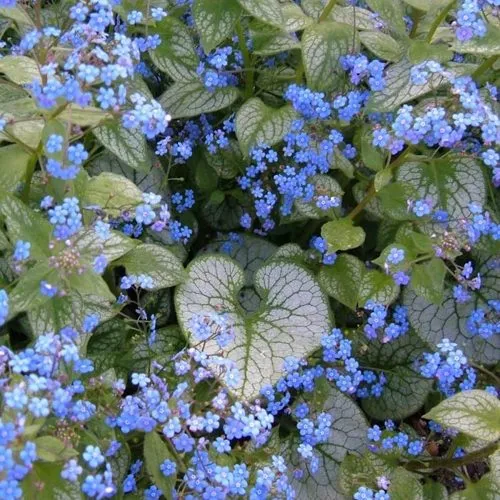 Бруннера Джек Фрост (Brunnera Jack Frost) —  растение, которое не просто "закроет" тень, а сделает её выразительной, этот сорт не зависит от цветения — декоративен весь сезон. Серебристая листва с чёткими зелёными прожилками выглядит как рисунок по инею, а весной над ней распускаются крошечные небесно-голубые цветки, словно забытые фрагменты незабудки.