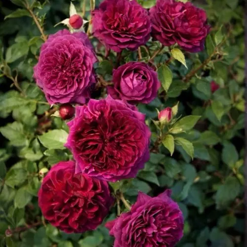 Главное достоинство — цветы. Бутон густомахровый, с 30+ лепестками, чашевидной формы. Диаметр раскрытого цветка достигает 10 см. Окрас нестандартный: летом — насыщенный пурпурно-свекольный, ближе к осени темнеет до почти чёрного с рубиновыми бликами. Цветение длится с начала лета до заморозков, волнообразное и равномерное. Один куст даёт 1–3 цветка на стебле. Аромат насыщенный, тёплый, с фруктово-пряными нотами, особенно выражен в утренние часы.
