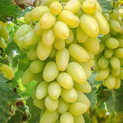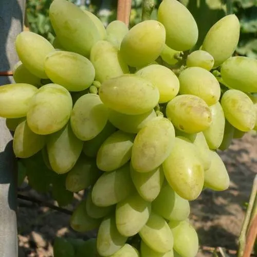 Грозди этого сорта впечатляют размерами — от 400 до 600 граммов. Они имеют изысканную цилиндро-коническую или коническую форму, которая делает их особенно красивыми. Ягоды крупные, массой 6-8 граммов, овальной или сосковидной формы с заостренным кончиком. На солнце они приобретают изумительный янтарный или слабокоричневый загар, что добавляет им визуальной привлекательности.