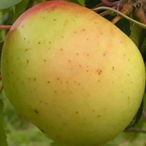 • Плоскоокруглой, немного уплощённой формы, желтовато-зелёного, с размытым розовым покровом, цвета. Кожица ровная и прочная, покрыта малым количеством светлых подкожных точек. Мякоть плотная и сочная, по структуре - хрустящая, жёлто-белого цвета;