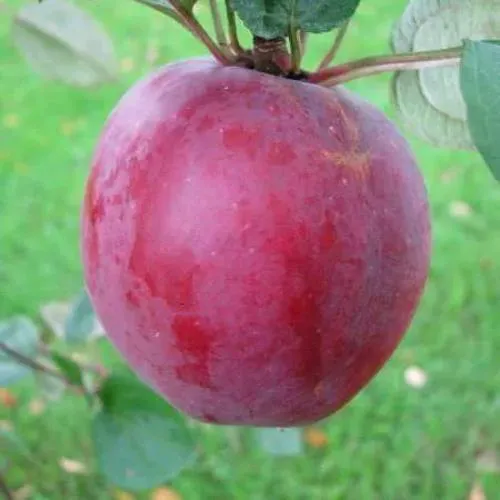 Деревья среднерослые, а плоды крупные и приплюснуто-округлые, неодномерные. Они имеют желтовато-зеленую основную окраску и размытый густой рубиново-красный румянец почти на всей поверхности. Кожица плотная и блестящая, средней толщины.